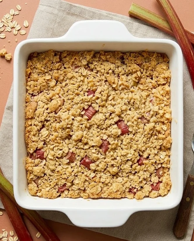 Most rhubarb recipes ask you to choose between a crumble and a cheesecake. This one refuses. Rhubarb cheesecake squares layer both into a single nine-inch pan — a buttery oat …