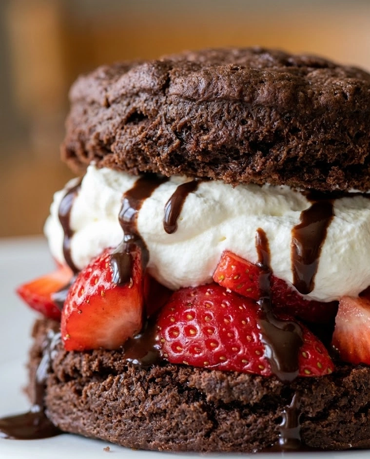 Imagine biting into a tender chocolate biscuit that’s rich but not overly sweet, layered with fresh strawberries in their sweet syrup, and topped with pillowy whipped cream. The chocolate doesn’t overpower the berries—instead, it creates the most beautiful flavor harmony, like chocolate-covered strawberries in shortcake form. This is the kind of dessert that makes people close their eyes and sigh with happiness.