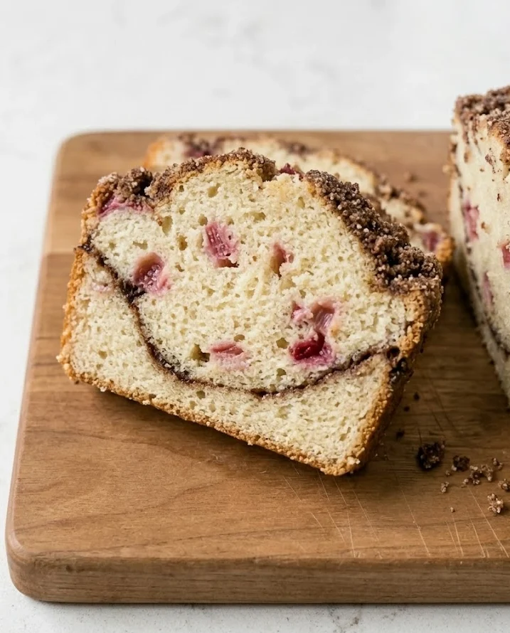 Strawberry rhubarb bread: Replace half the rhubarb with an equal amount of diced fresh strawberries. The berry sweetness softens the tartness of the rhubarb and creates a filling that edges toward jam — one of the most beloved strawberry rhubarb recipe combinations in any format.