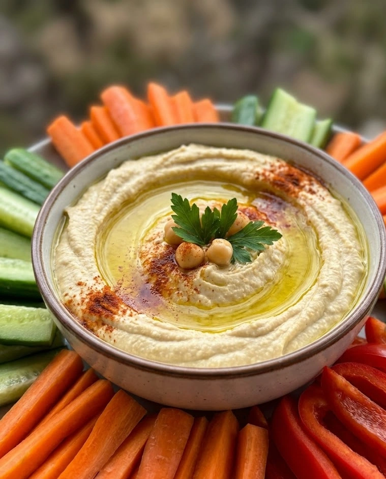 Refrigerator: Store hummus in an airtight container with plastic wrap pressed directly against the surface to prevent drying. Keeps for 5-7 days. Cut vegetables store separately in sealed containers with damp paper towels for up to 3 days.