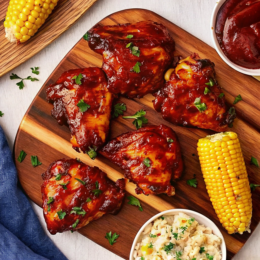 Teriyaki Chicken Thighs: Substitute the BBQ sauce with a homemade or store-bought teriyaki sauce for an Asian-inspired flavor profile. Garnish with sesame seeds instead of parsley.