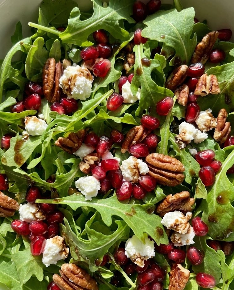 Texture-wise, this salad is a masterpiece. Crisp arugula, crunchy nuts, juicy pomegranate arils, and creamy cheese create a symphony of sensations. Every forkful offers something different, keeping each bite interesting from start to finish.