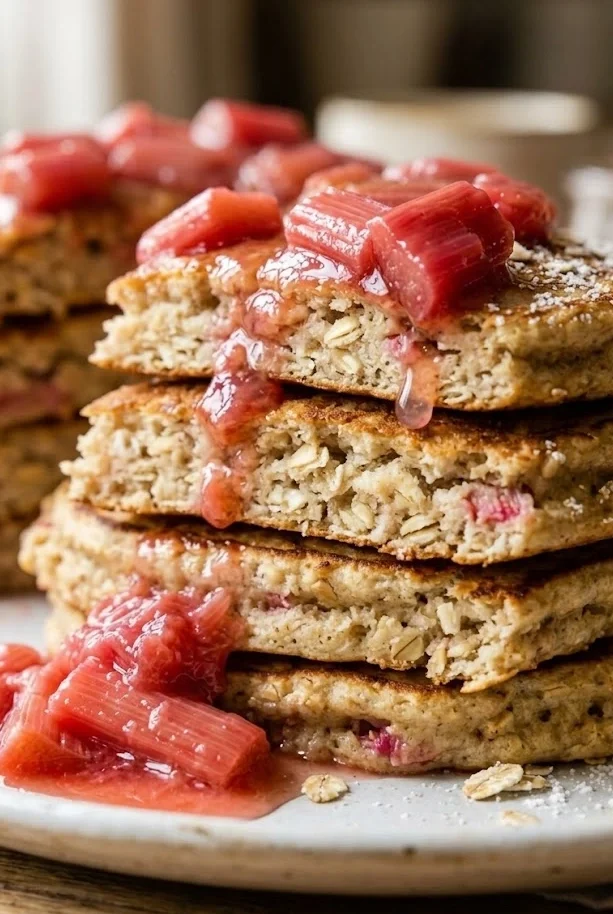 How is this different from rhubarb recipes crisp or rhubarb bars recipes for breakfast? Rhubarb recipes crisp and rhubarb bars recipes are baked formats that work as dessert or an occasional breakfast treat but are generally higher in sugar and fat. These oatmeal pancakes are specifically designed as a morning meal — lower in sugar, higher in fiber from the oats, and built around a batter format that produces a proper breakfast stack rather than a dessert portion.