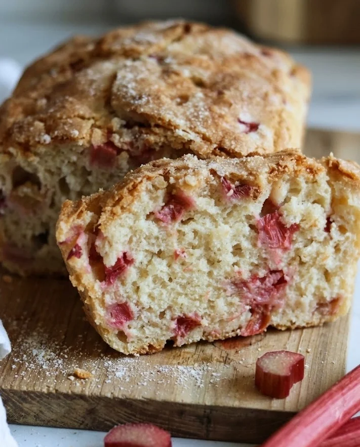 The result is a moist, tender loaf laced with tart rhubarb chunks and finished with a sprinkle of sugar that bakes into a crispy, caramelized crust. It is extraordinary for how simple it is to make.