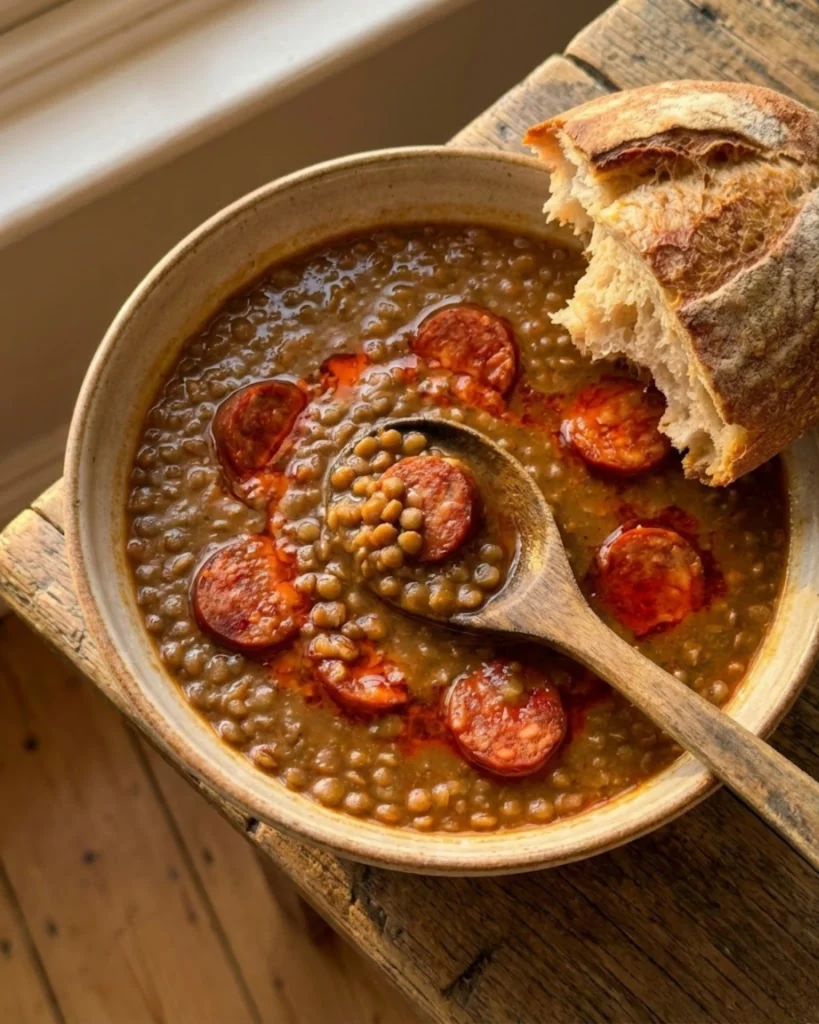Picture this: smoky Spanish chorizo releasing its vibrant red oil into the pot, tender brown lentils, and chunks of potato simmering together in a paprika-infused broth that smells absolutely incredible. Each bite is hearty, warming, and packed with layers of flavor that only get better as they meld together.