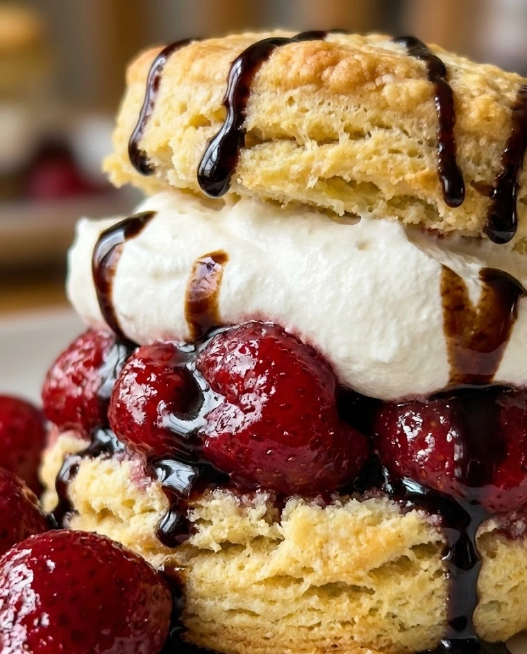 Imagine biting into a tender, buttery shortcake biscuit piled high with glossy balsamic-roasted strawberries and clouds of sweet whipped cream. The balsamic brings out the natural sweetness of the berries while adding a subtle tangy complexity that makes every bite more interesting than the last. This isn’t just dessert—it’s an experience that captures that elegant strawberry shortcake aesthetic while delivering restaurant-quality flavor.