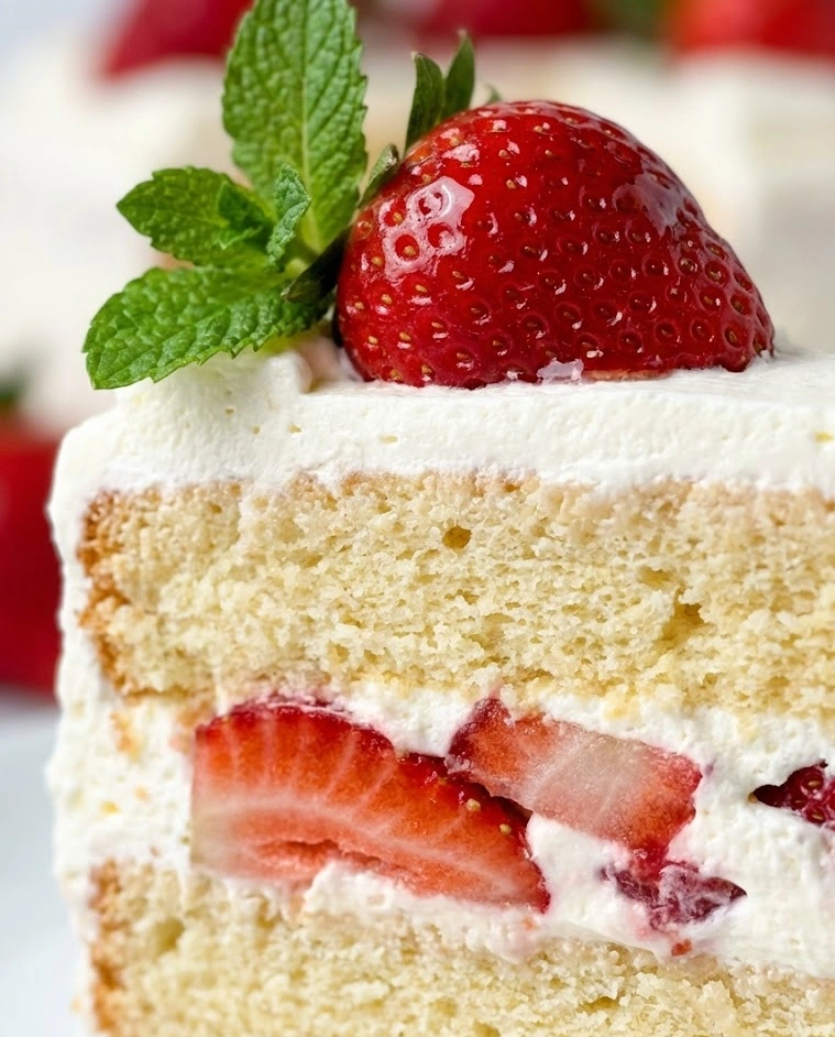 This isn’t your average cake. The tender vanilla layers are incredibly moist and delicate, almost melting on your tongue. The fresh strawberries add bright, juicy bursts of flavor that cut through the richness perfectly.
