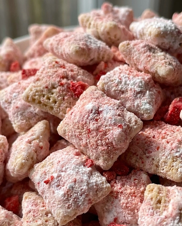 - Spread puppy chow on parchment paper to cool for 10 minutes. Toss with remaining crushed strawberries before serving.